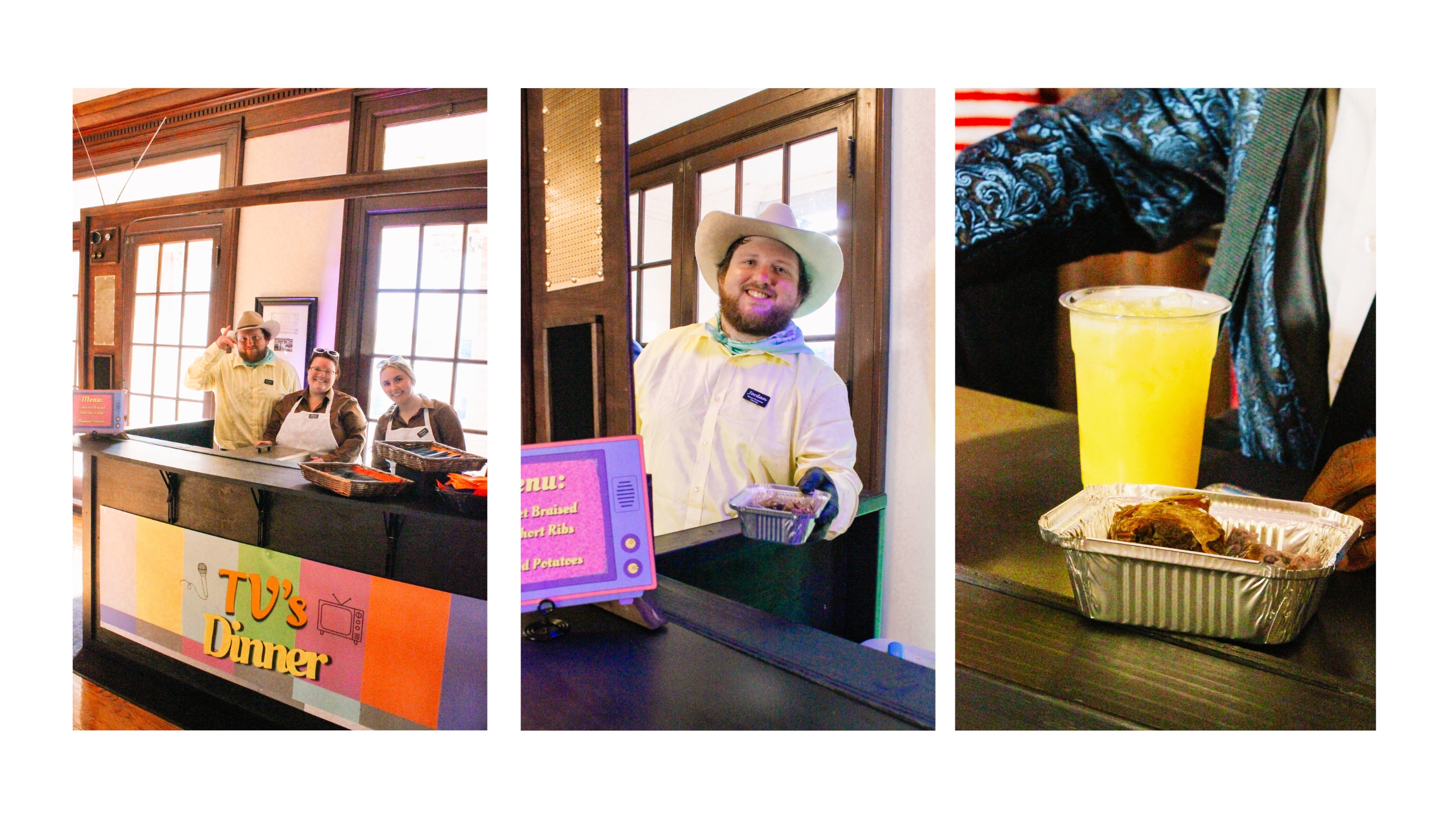 For the main event, we created several themed small plate stations. The TV Dinner Station, a nostalgic nod to the old, vintage aluminum TV Dinner trays, featured Cabernet Braised Beef Short Ribs served with Purple Mashed Potatoes. These vibrant potatoes were also a playful reference to the blueberry gum scene and added a splash of color to our vintage TV dinner trays they were served in.