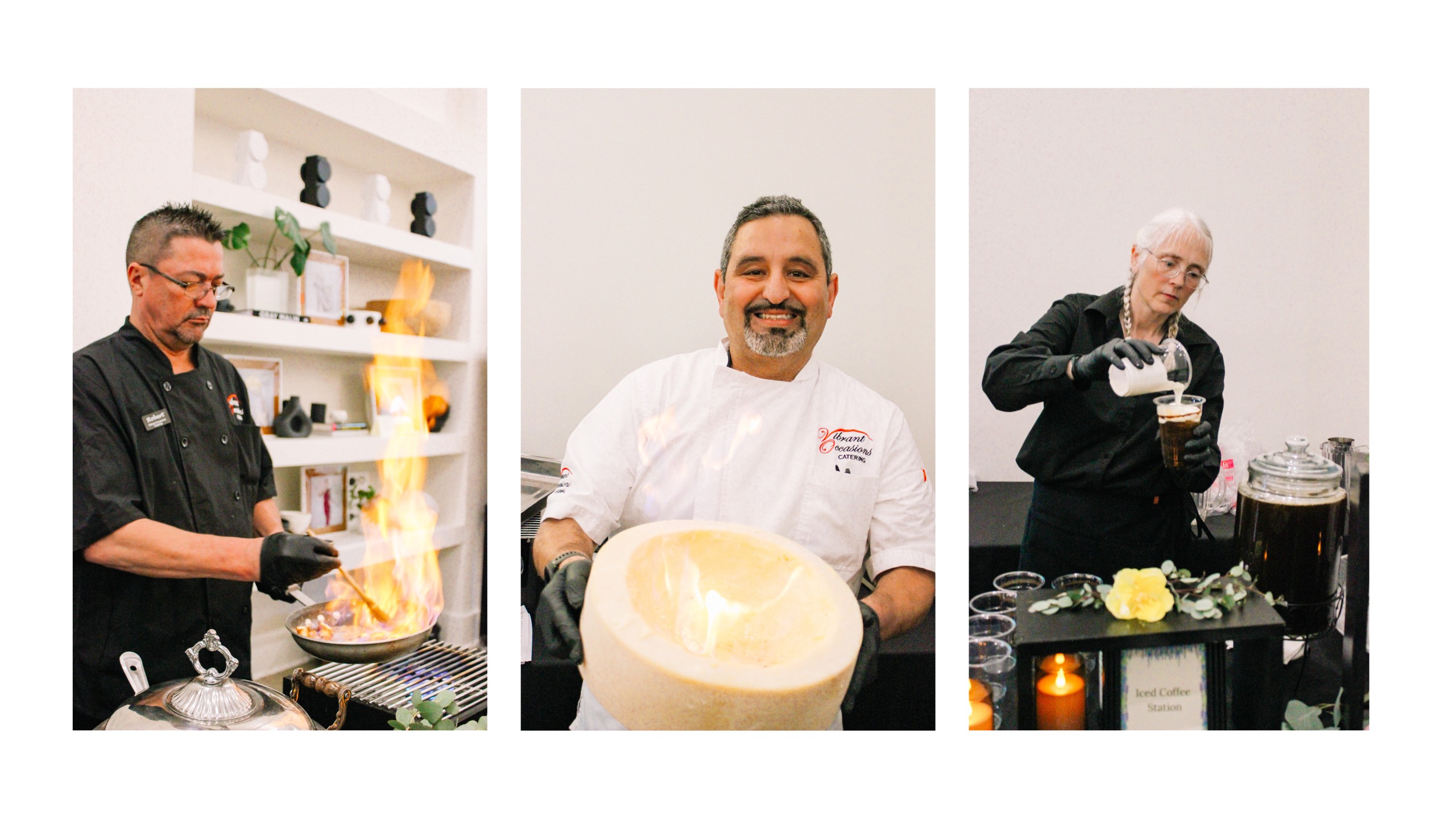 As the evening progressed, we introduced additional stations to keep the culinary excitement flowing. Our donut flambé station offered a decadent treat, while our iced coffee station provided a refreshing interlude. To ensure a sweet ending, we added dessert macarons to the selection of passed hors d’oeuvres at 7:00 p.m., providing a delightful conclusion to the culinary journey.