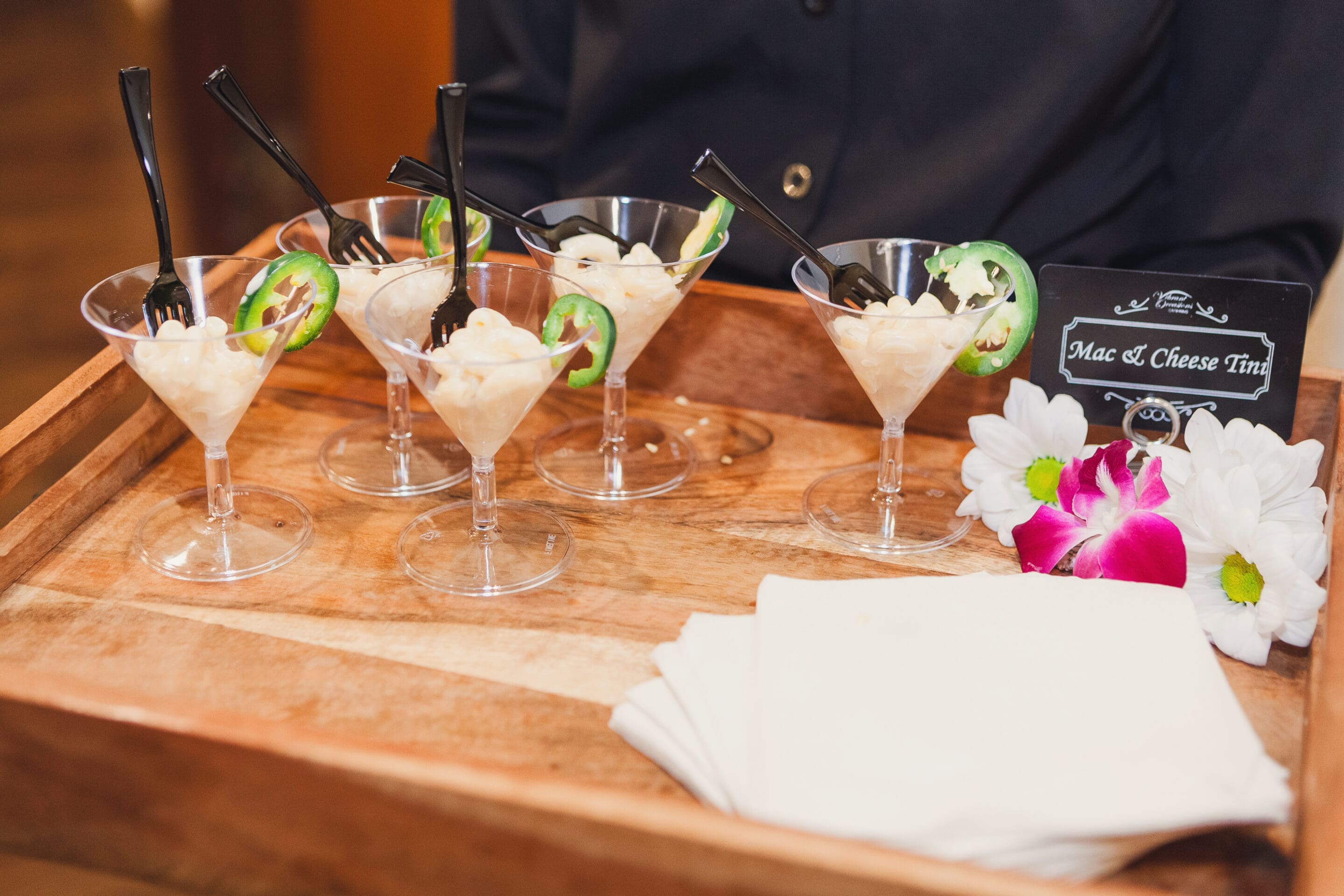 The evening began with passed hors d’oeuvres that set the tone for the innovative menu to come. Guests mingled during cocktail hour, enjoying mini chicken & waffles drizzled with maple syrup and creamy jalapeño mac & cheese served in stylish mini martini glasses. The avocado steak toast topped with smoked beef tenderloin and crispy onion tanglers proved to be a crowd favorite, while spinach artichoke crostini offered a vegetarian option that disappeared just as quickly.